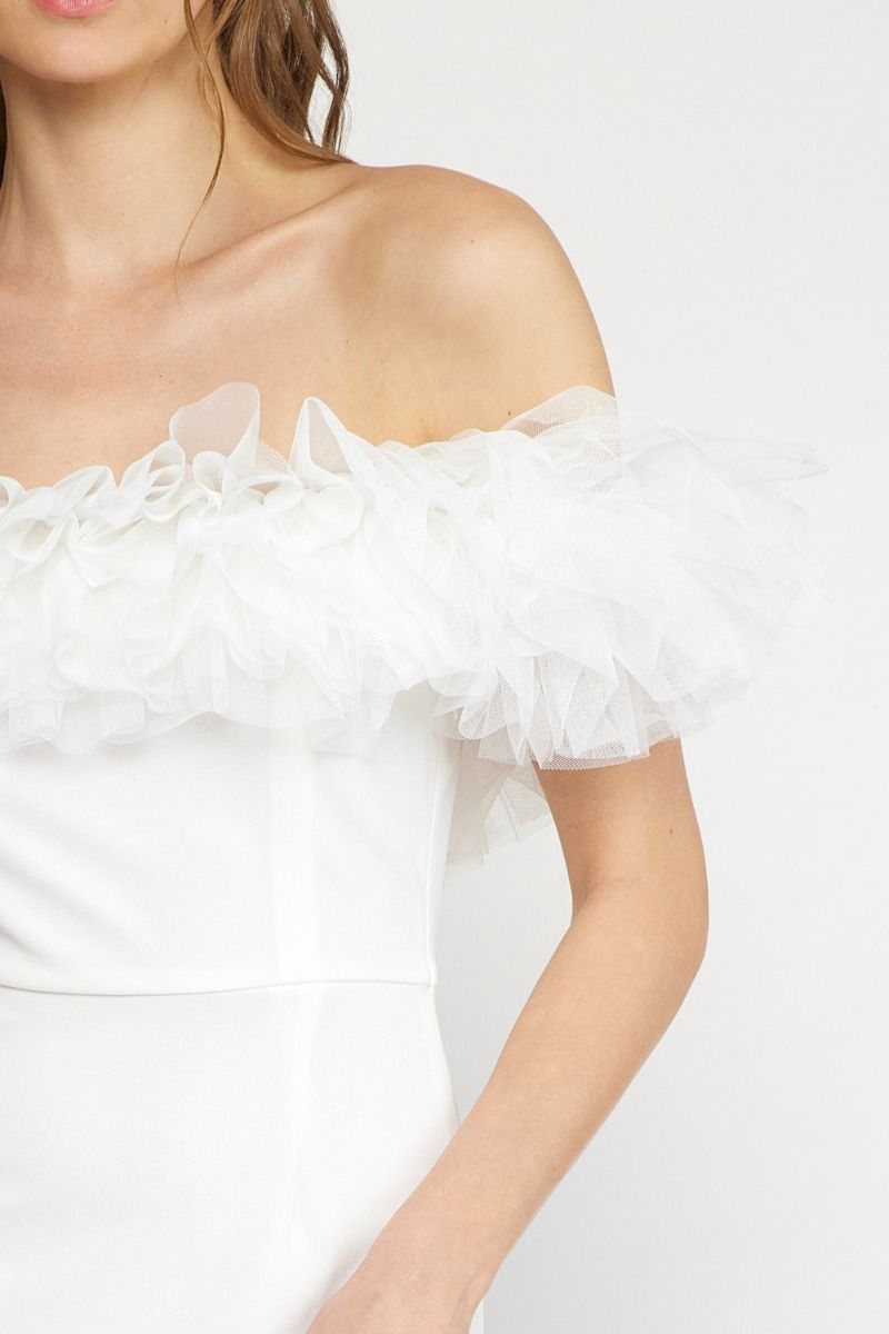 - Off the shoulder with tulle trim detail