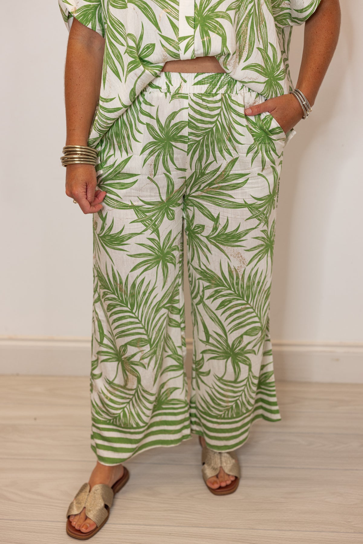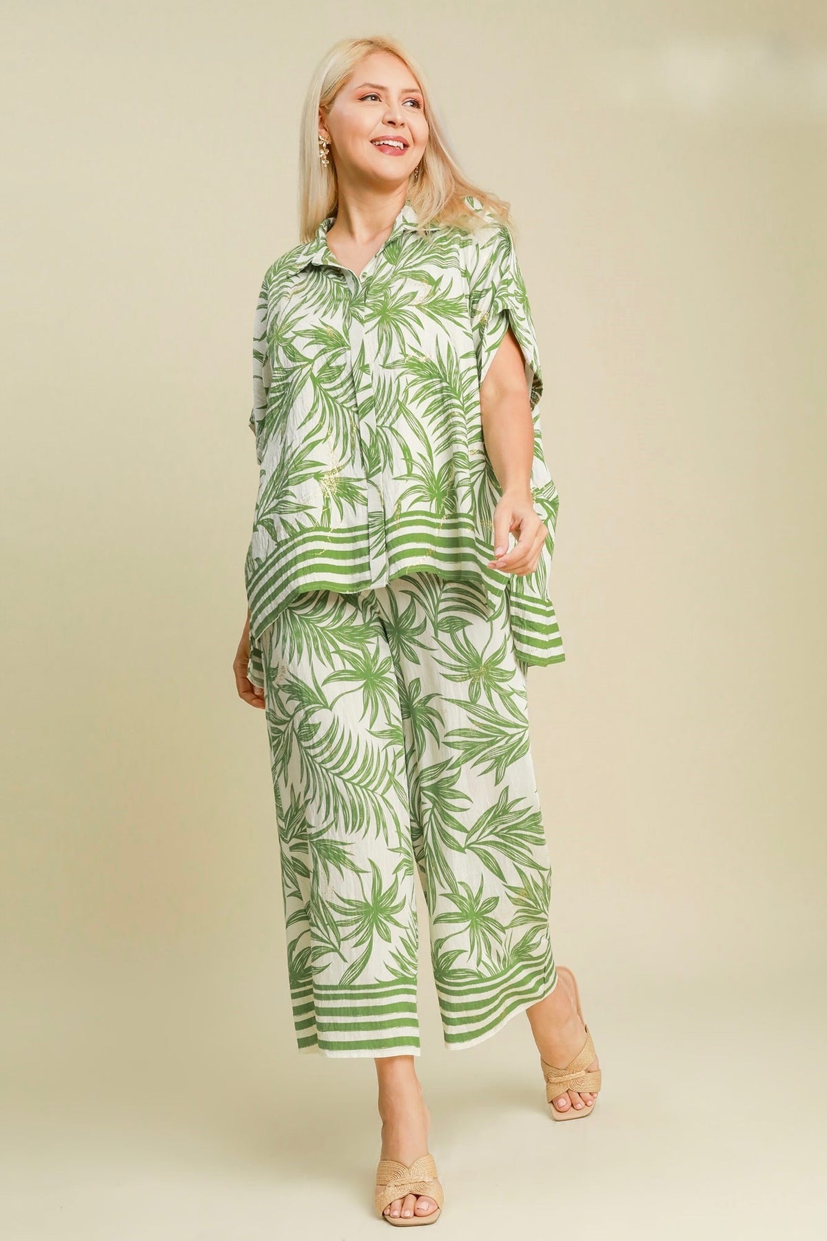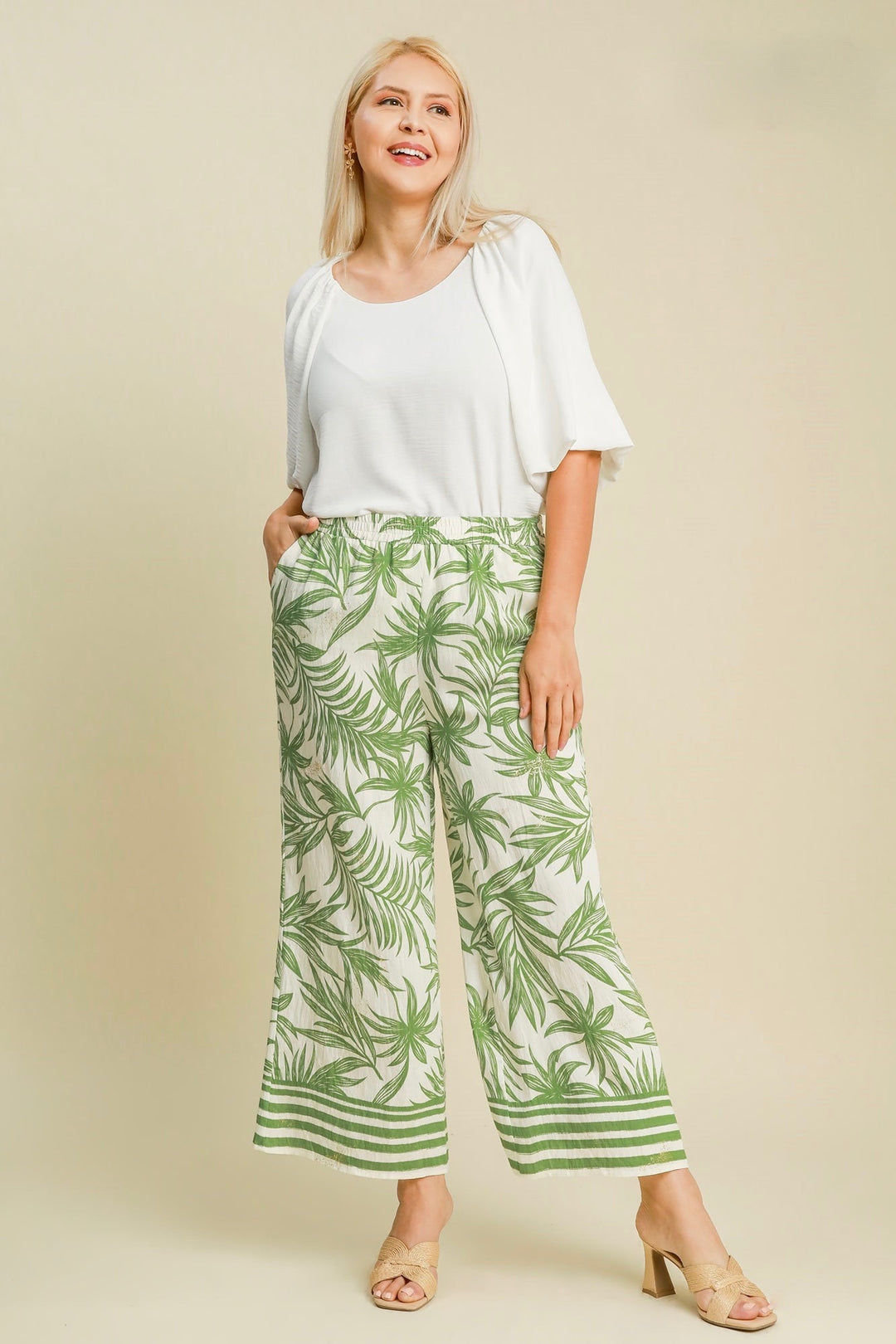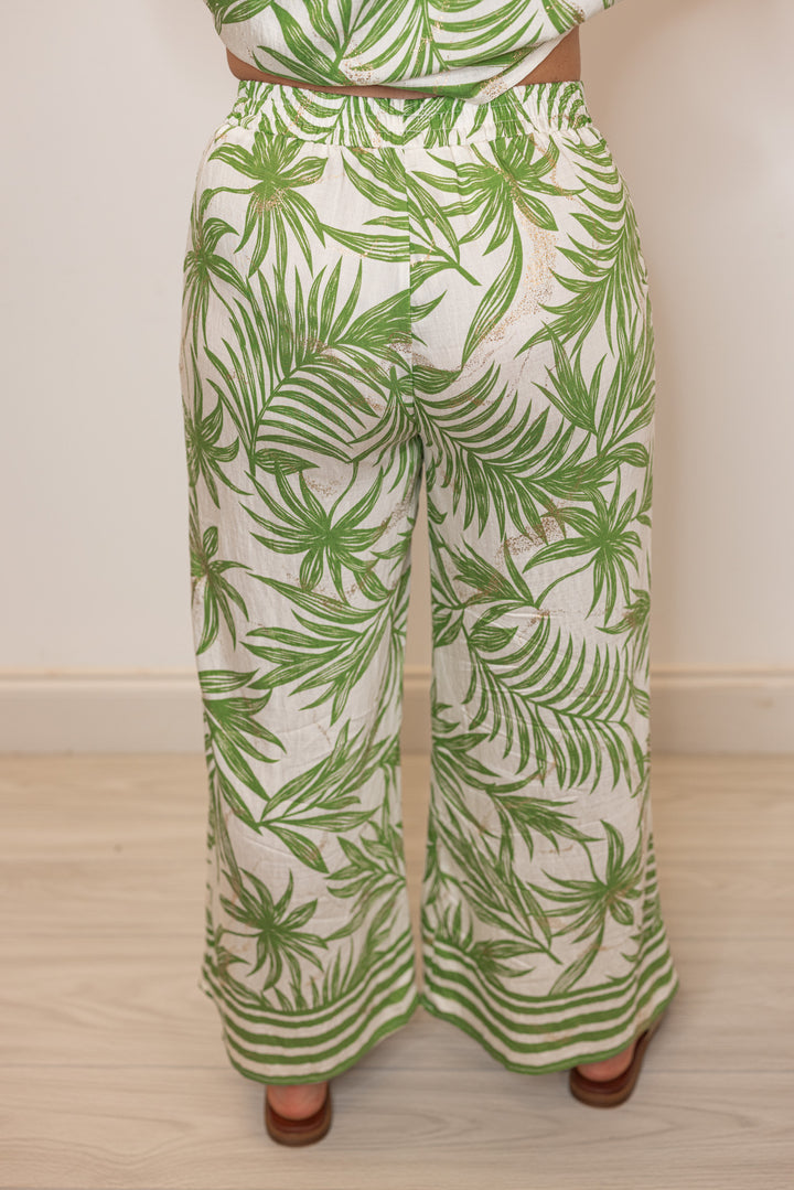 Get ready to vacation in style with our Palm Tree Paradise Cream Pants! These adorable pants have a green palm tree print featuring metallic gold accents. With an elastic waistband and wide legs, they're perfect for lounging with friends or a day out sightseeing. Complete the look with our matching top for a comfy resort style outfit!