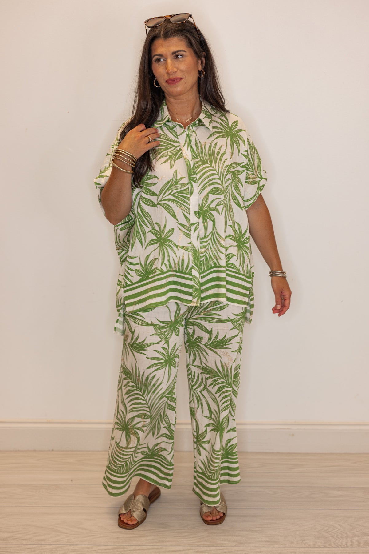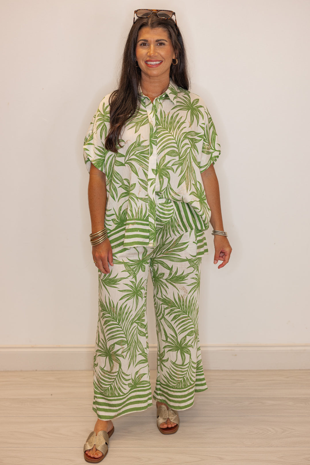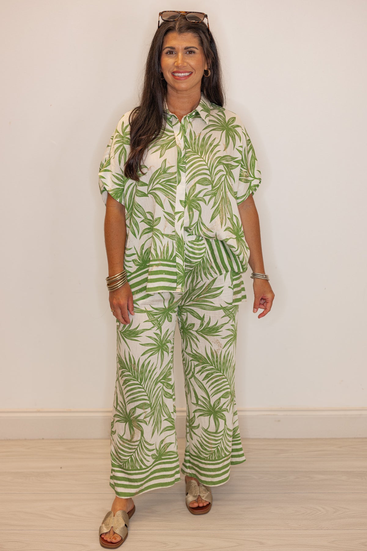Get ready to vacation in style with our Palm Tree Paradise Cream Pants! These adorable pants have a green palm tree print featuring metallic gold accents. With an elastic waistband and wide legs, they're perfect for lounging with friends or a day out sightseeing. Complete the look with our matching top for a comfy resort style outfit!