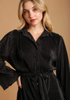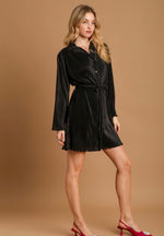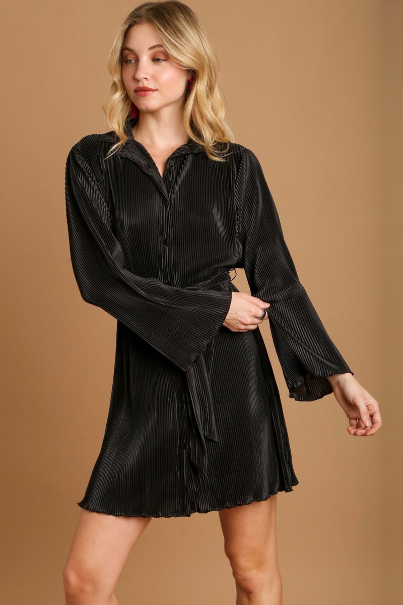 We know ya'll love pleated satin! This cute babe will be your go-to effortless but sassy 'Little Black Dress'! Featuring a button down front with collar, long sleeves, and a self tie removable belt. She will have you feeling fabulous no matter the occasion!