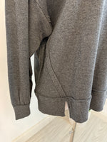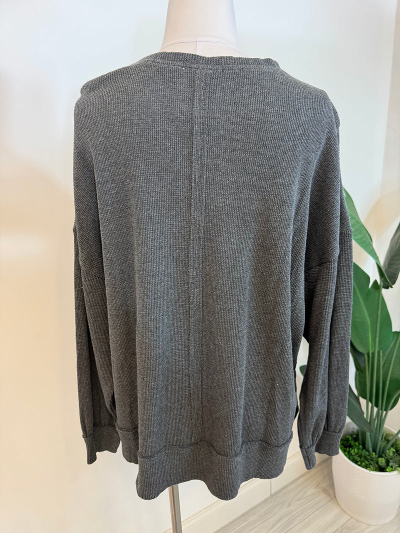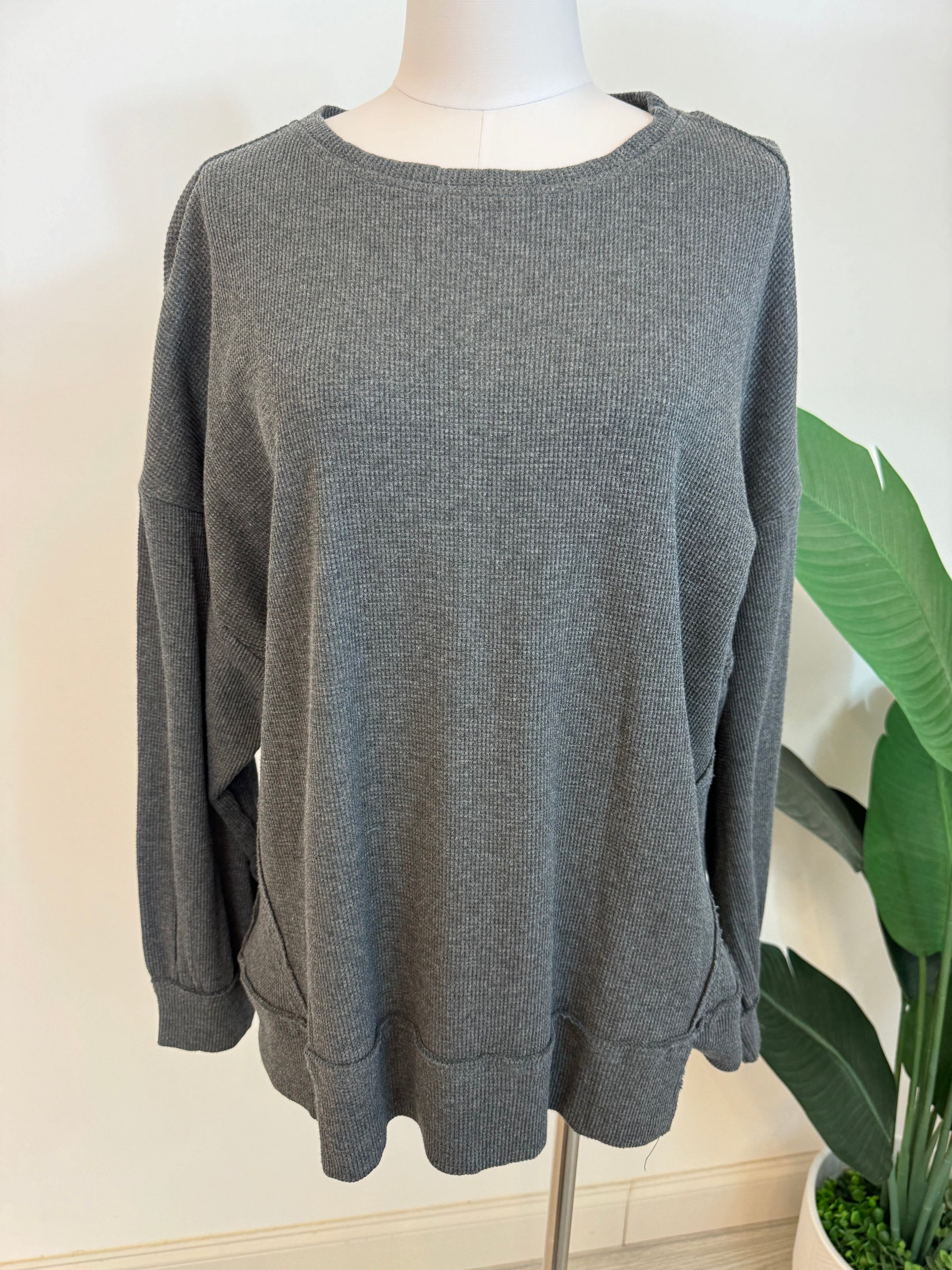 Ribbed waffle knit tops are just so cozy, and this cute new babe is definitely a fan fav! Washed charcoal fabric featuring a crew neckline, dropped shoulder with ribbed cuffed long sleeves, side slits in the bottom hemline, and reverse seam details throughout. She's as comfy as she is cute! Perfect with leggings and boots for a day out with friends, or with joggers and sneakers to run errands.