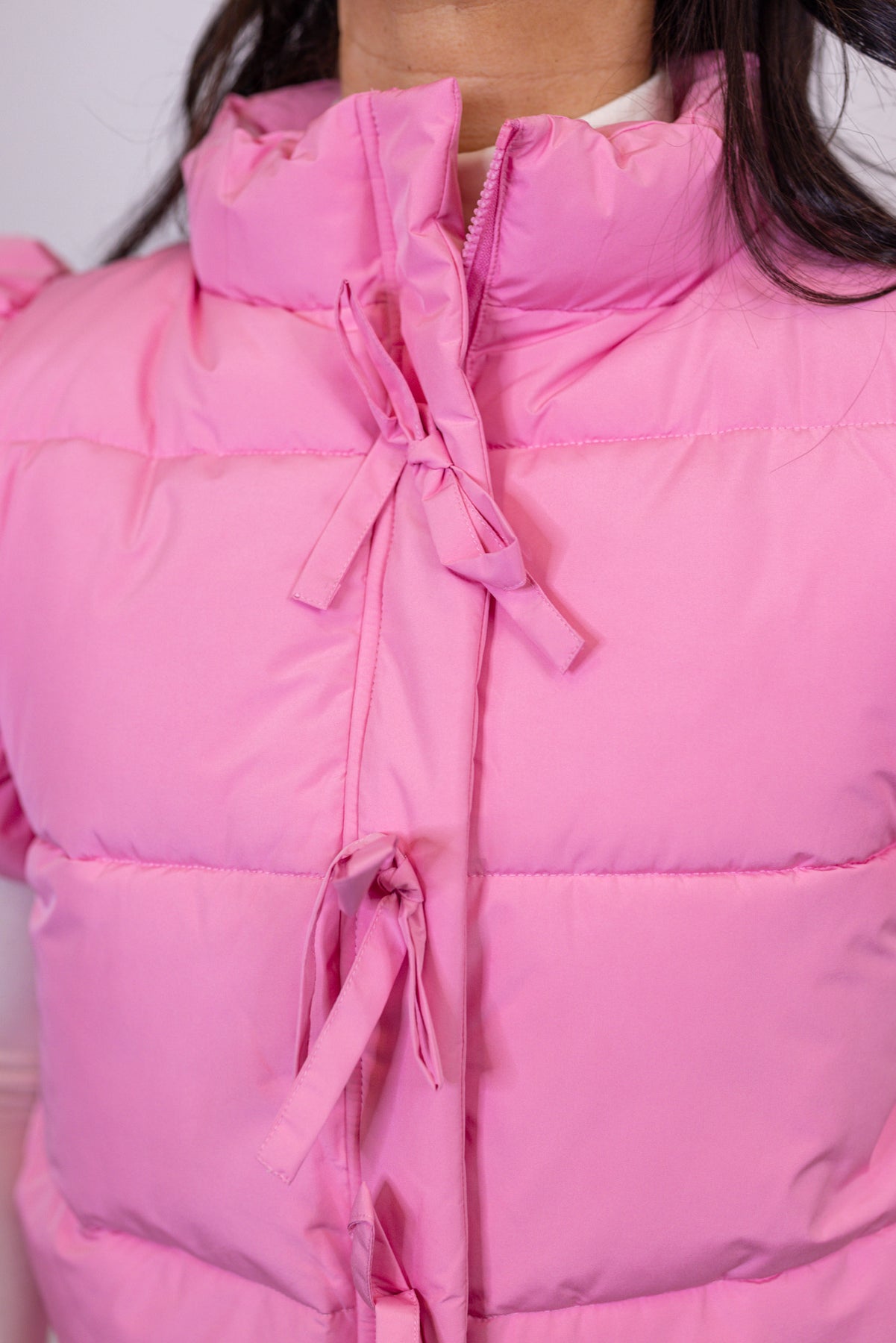 Add some fun and flair to your Winter wardrobe with the Ruffled Charm Pink Puffer Vest! This adorable vest features pink quilted puffer fabric, a zipper front closure with bow tie details, and ruffle trim at the shoulders. She's the perfect touch of whimsy your wardrobe needs!