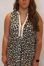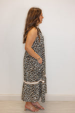 Get ready to channel your wild side with our Safari Dreams Caramel Midi Dress! With a caramel, cream, and black leopard print, this dress will have you feeling fierce and fabulous. The v neckline and sleeveless design add a touch of sophistication, while the tiered bottom hem and caramel and cream striped trim details add a playful twist. Perfect for a day out or a night on the town, this dress is a must-have in your wardrobe!