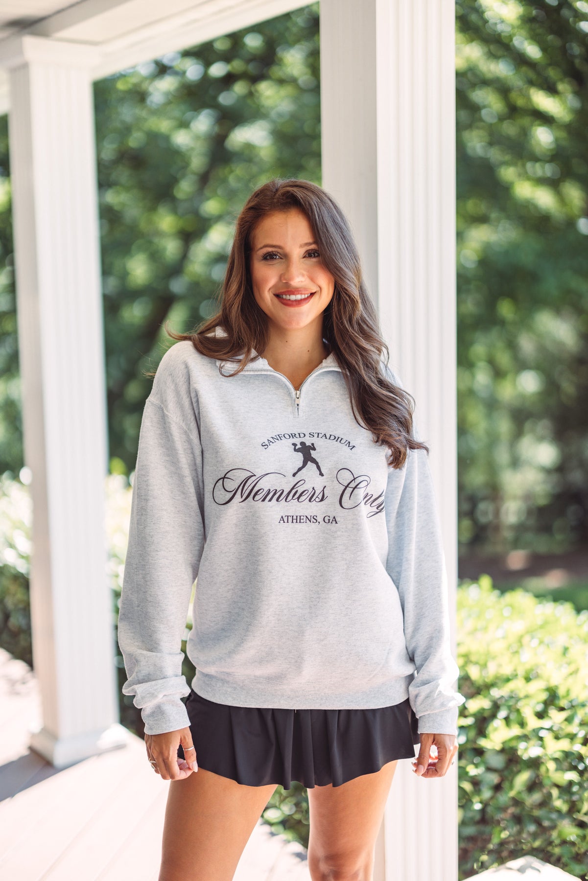 Team pride at its best! Distressed Vintage Couture grey quarter zip sweatshirt, featuring Sanford Stadium Members Only graphics. Perfect for UGA gamedays!! This stylish babe is cute and comfy, making her a must-have for any fashion-forward fan.