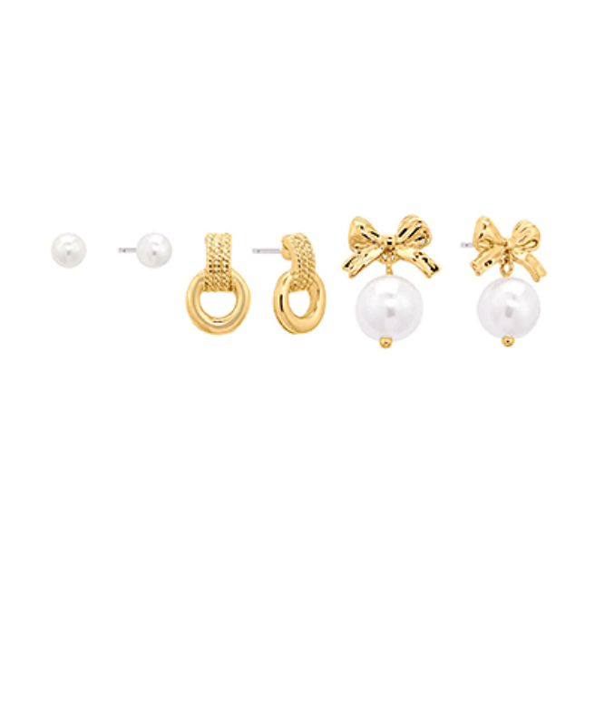 Complete your look with a touch of elegance and playfulness with our set of 3 Pearl and Bow Earrings. Featuring a stylish combination of huggie hoops and delicate bow-shaped studs, adorned with heart motifs, these unique earrings are perfect for adding a touch of whimsy to any outfit. A must-have for any fashion lover!
