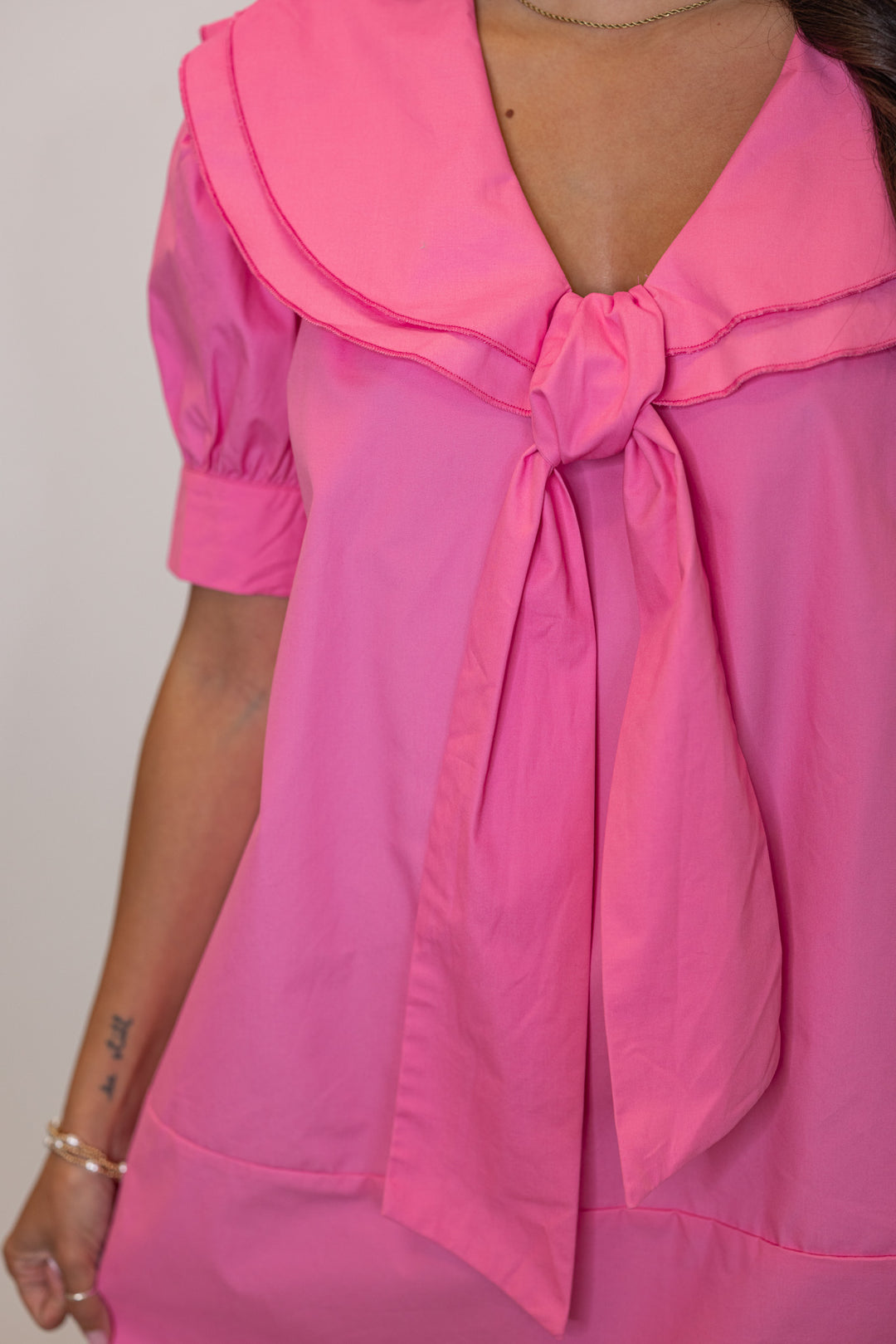 Get ready to Set Sail in this adorable pink shift dress! Featuring a bow tie sailor collar, puff sleeves, and a tiered bottom hem. Perfect all season long, whether dressing her up for a Summer party, or heading off on a cruise vacation!