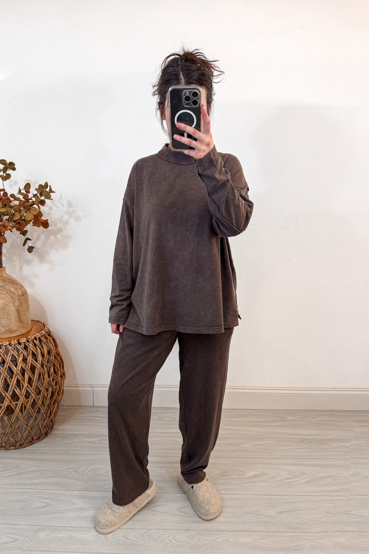 Simply That Good espresso brown mock neck pants set. Lightweight cotton fabric that's perfect to layer with your sherpa vest! Best selling mock neck top design with your fave elastic waistband cocoon pants! The pants are short girl and tall girl friendly! Model does have the pants pulled up a bit to suit her height at 5'2".