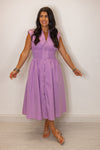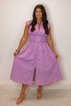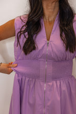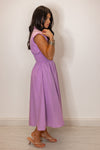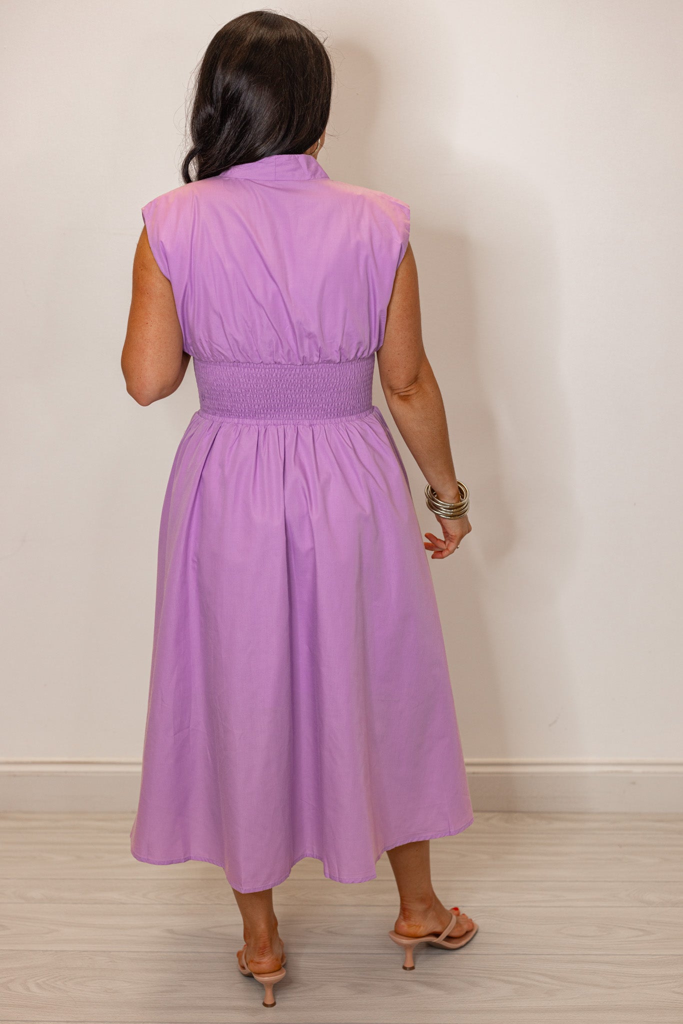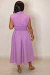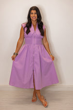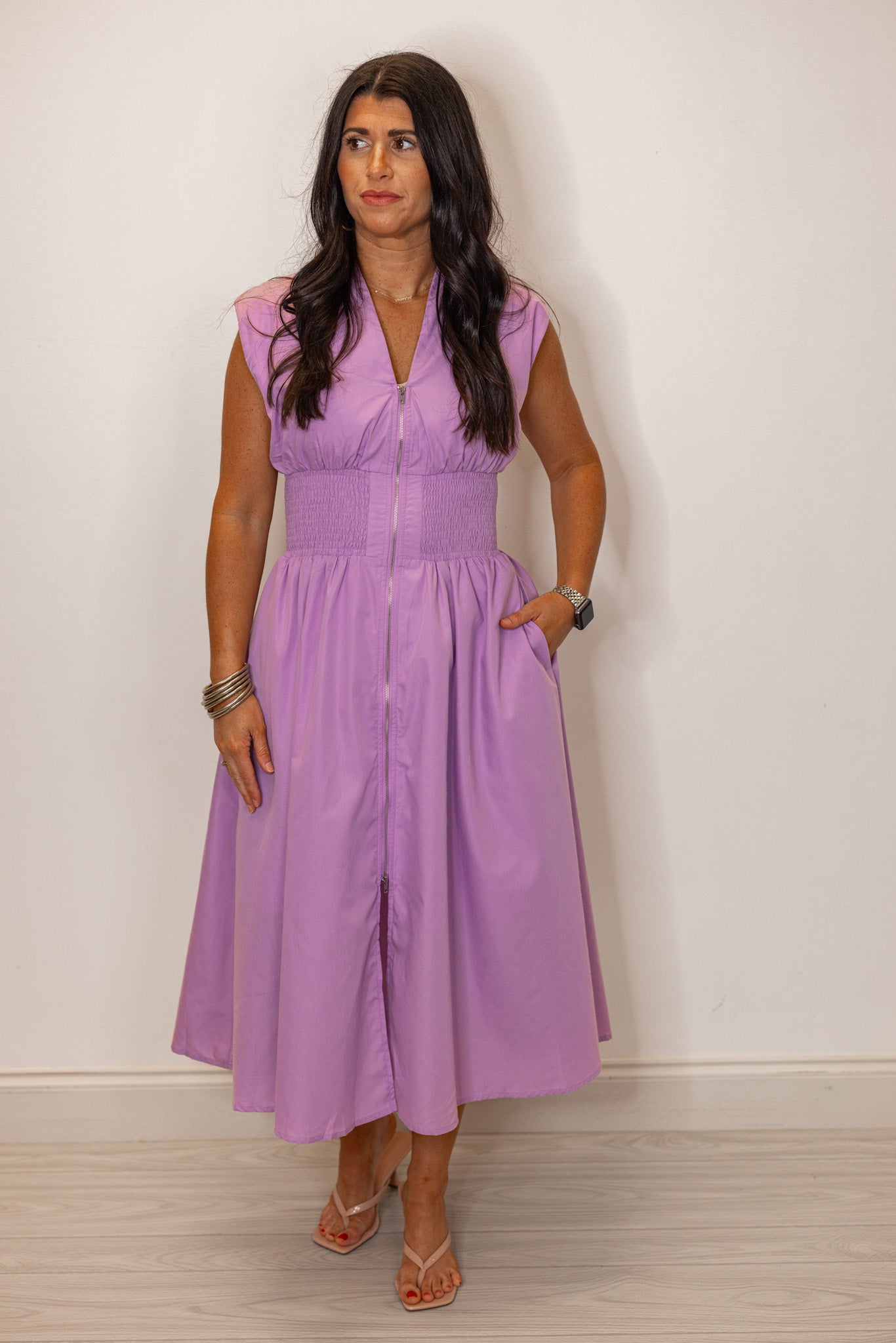 Be ready to Celebrate Summer in this lovely lavender midi dress! Featuring a v neckline, smocked waistline, and a zipper front closure with a front slit in the bottom hem. An elegant twist to your Summer style - she'll sass up any outing, dressy or casual!