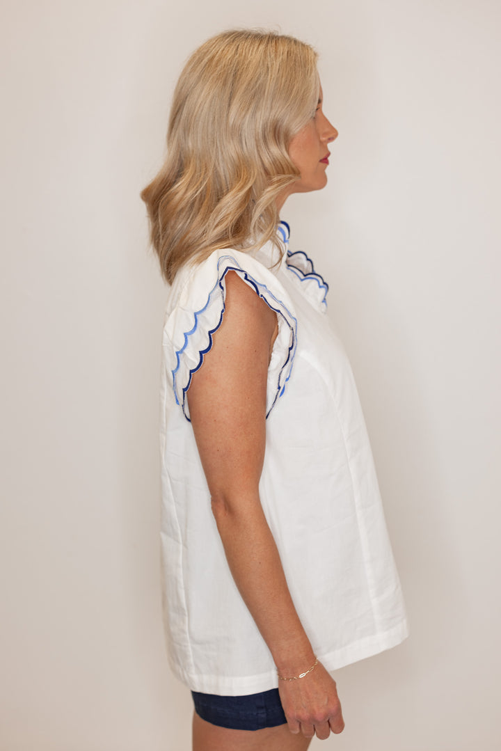 Get ready for summer with our Summer Waves Off White Top! Made from a cool off white poplin fabric, this top features a playful ruffle layered v neckline and ruffle layered sleeves, both outlined in blue and navy embroidered scalloped trim. Perfect for adding a touch of quirky charm to your summer wardrobe!