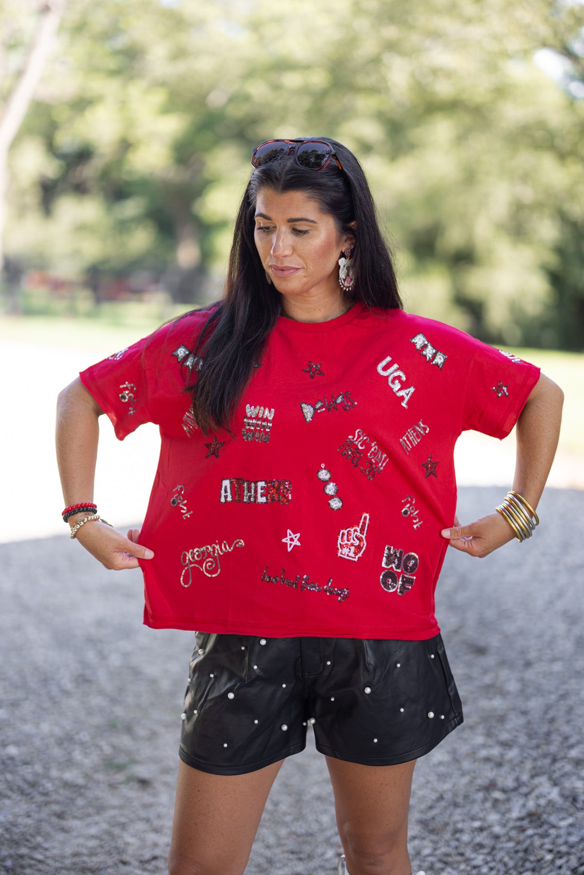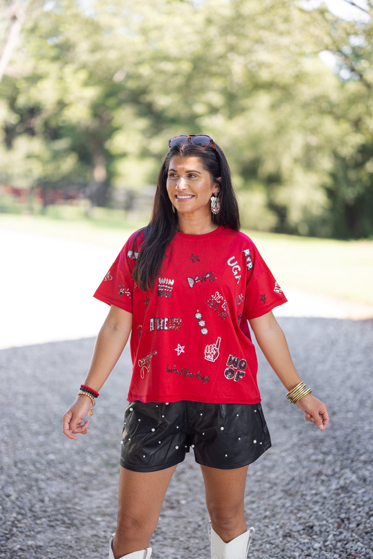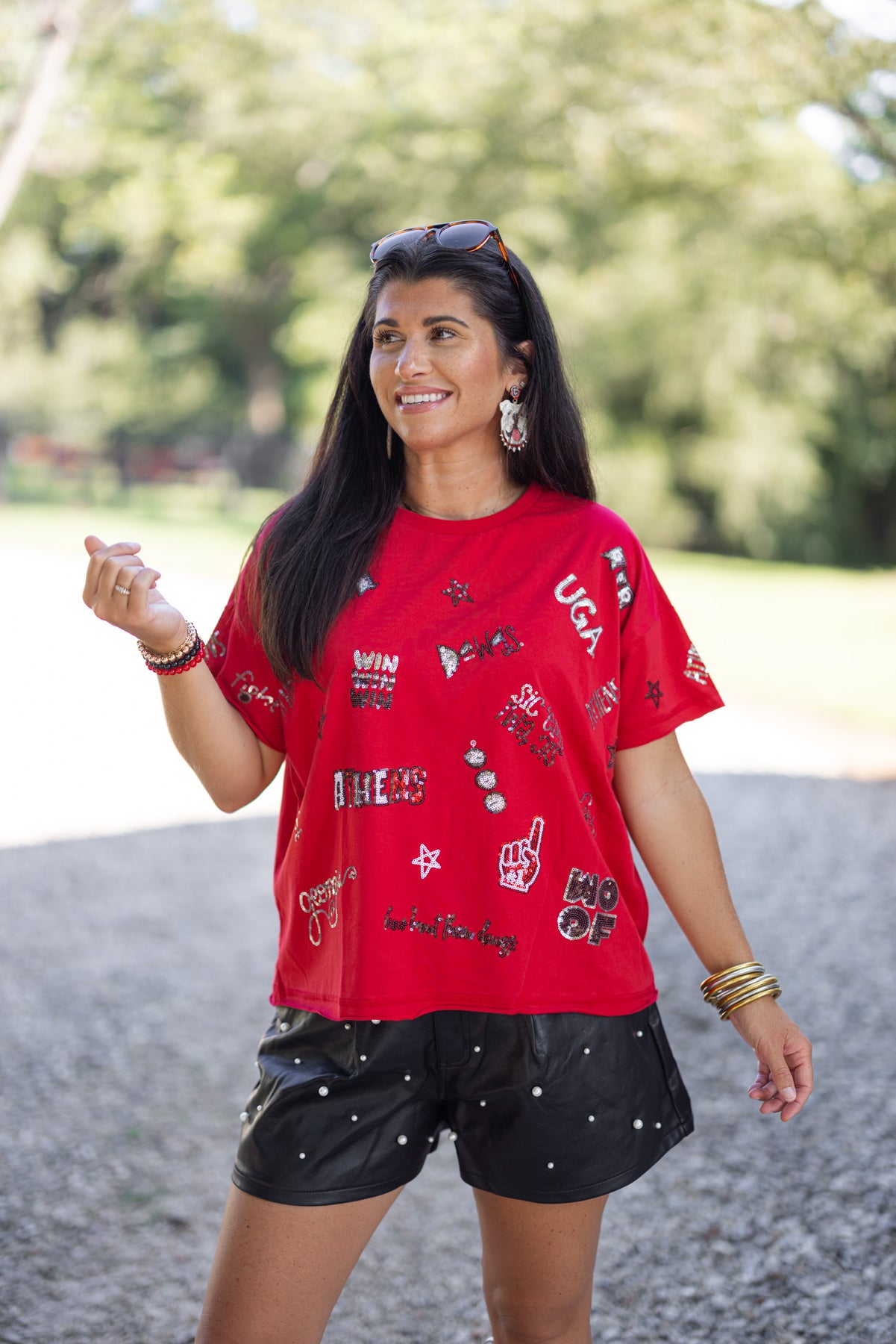How about them dawgs?! Be the talk of the tailgate! Full sequin school logos + phrases adorn the front and back of this top. The loose, boxy cut makes it comfortable and flattering on all body types. **This top is officially licensed so a portion of your purchase directly supports the university. Shop the look: Shorts | Boots