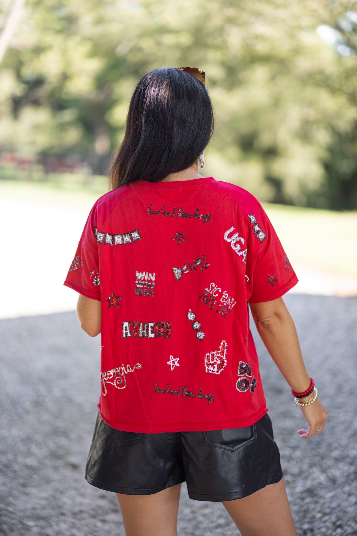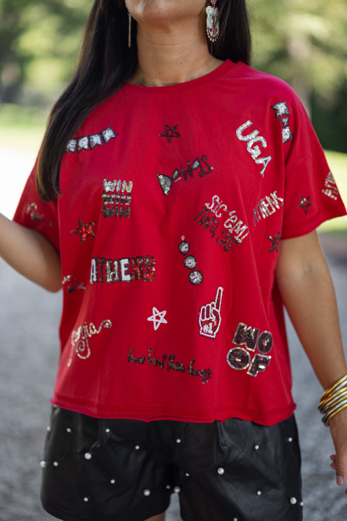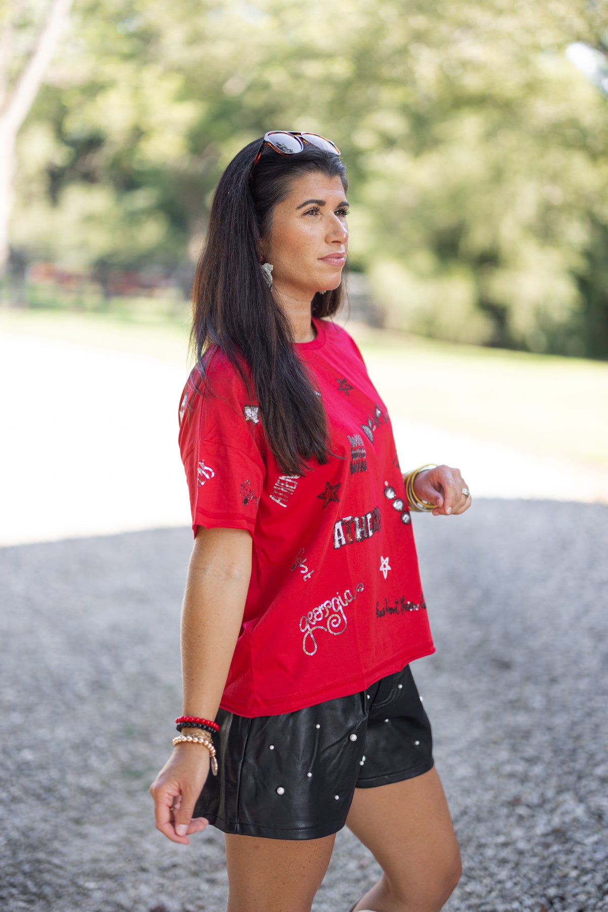 How about them dawgs?! Be the talk of the tailgate! Full sequin school logos + phrases adorn the front and back of this top. The loose, boxy cut makes it comfortable and flattering on all body types. **This top is officially licensed so a portion of your purchase directly supports the university. Shop the look: Shorts | Boots
