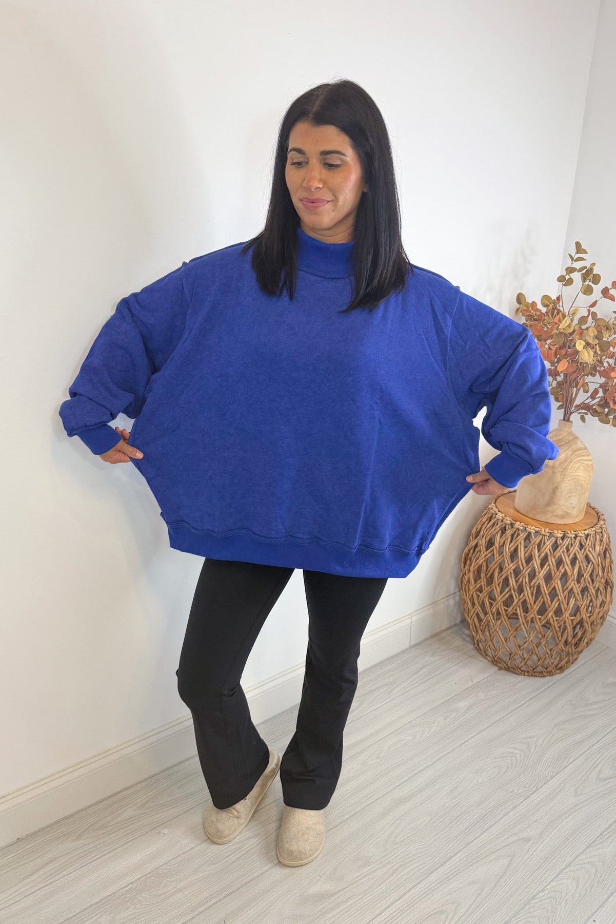 Wrap yourself in cozy charm with this mockneck washed royal blue sweatshirt! Crafted from soft French terry knit and featuring a comfy mock neck, cuffed long sleeves, and a banded bottom hem. Its oversized fit makes it perfect for relaxed days.