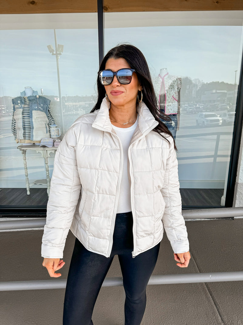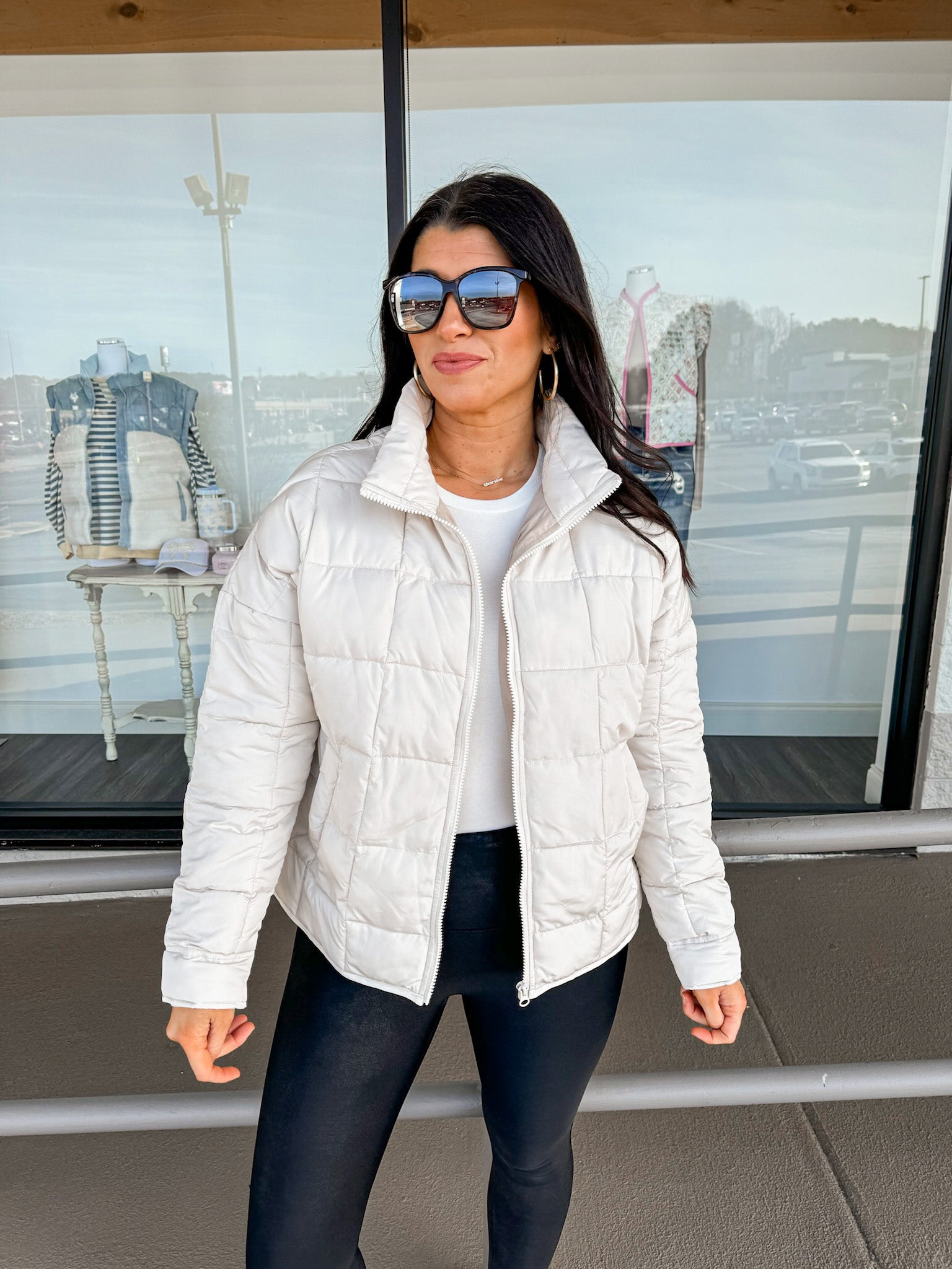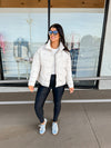Get cozy and stylish in our Winter Joy ecru puffer jacket! With a zipper front closure, and side pockets, this jacket is both functional and fashionable. You'll be trendy and warm all season long!